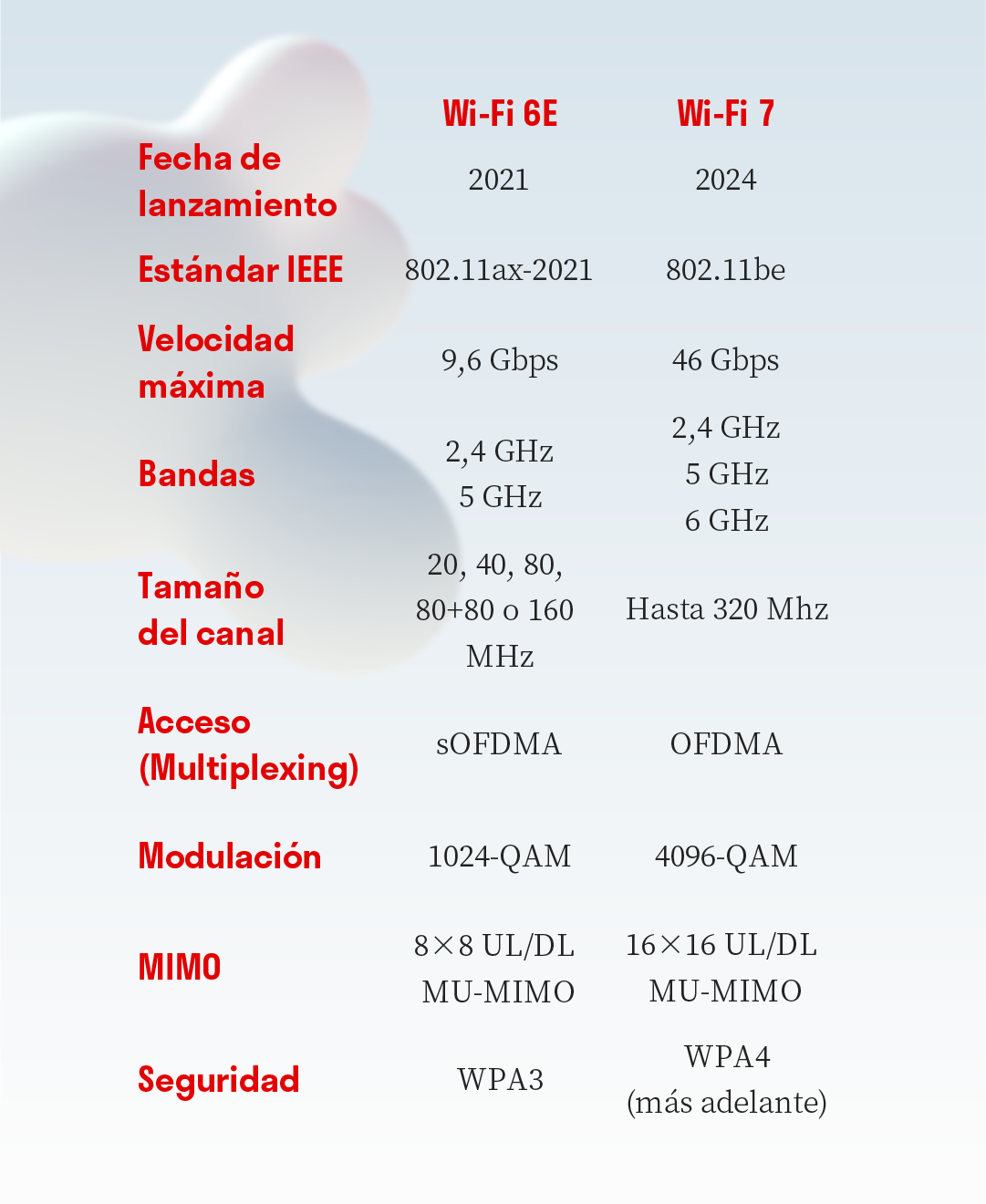 Presentado en el CES 2024, Wi-Fi 7 es la última incorporación hasta ahora, destacando con una velocidad teórica de hasta 46 Gbps, casi quintuplicando la velocidad máxima de Wi-Fi 6. Sus canales más amplios y la tecnología MU-MIMO 16×16 permiten una mayor capacidad para dispositivos y una menor latencia, siendo ideal para entornos de alto tráfico. También se trabaja en el estándar de cifrado WPA4 para reforzar la seguridad.